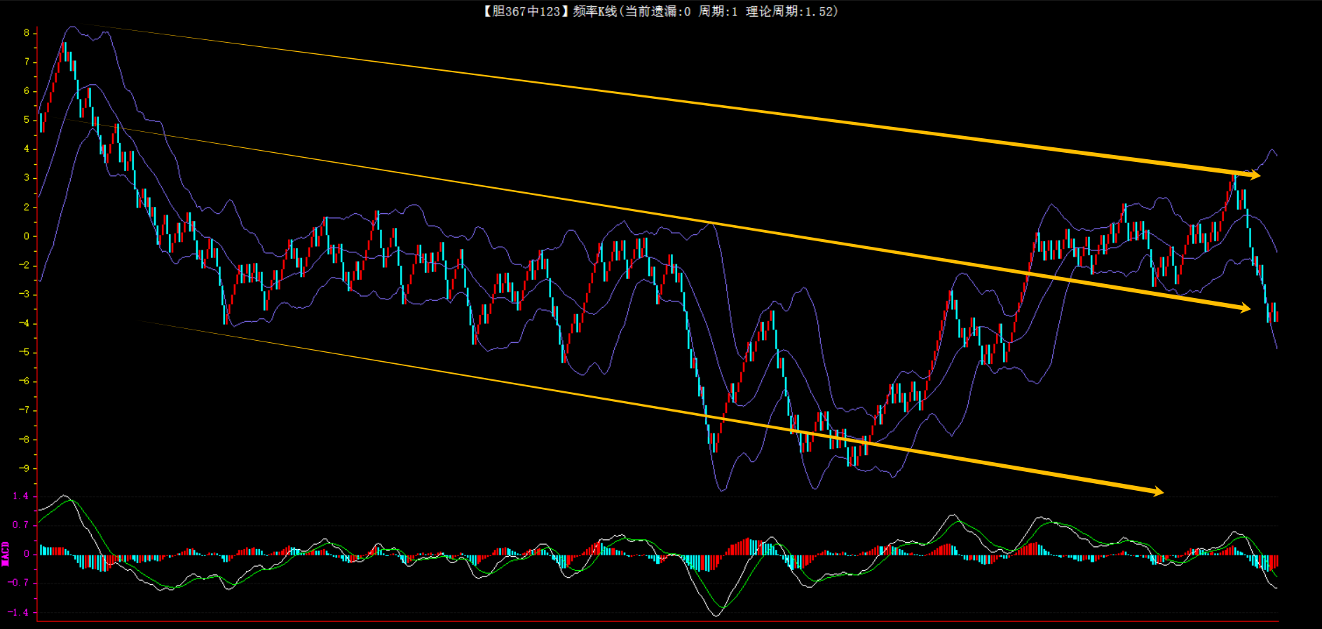 整体趋势下行,上边沿线趋势向下,下边沿趋势也是向下,节点震荡,当前开1期,本期防守。