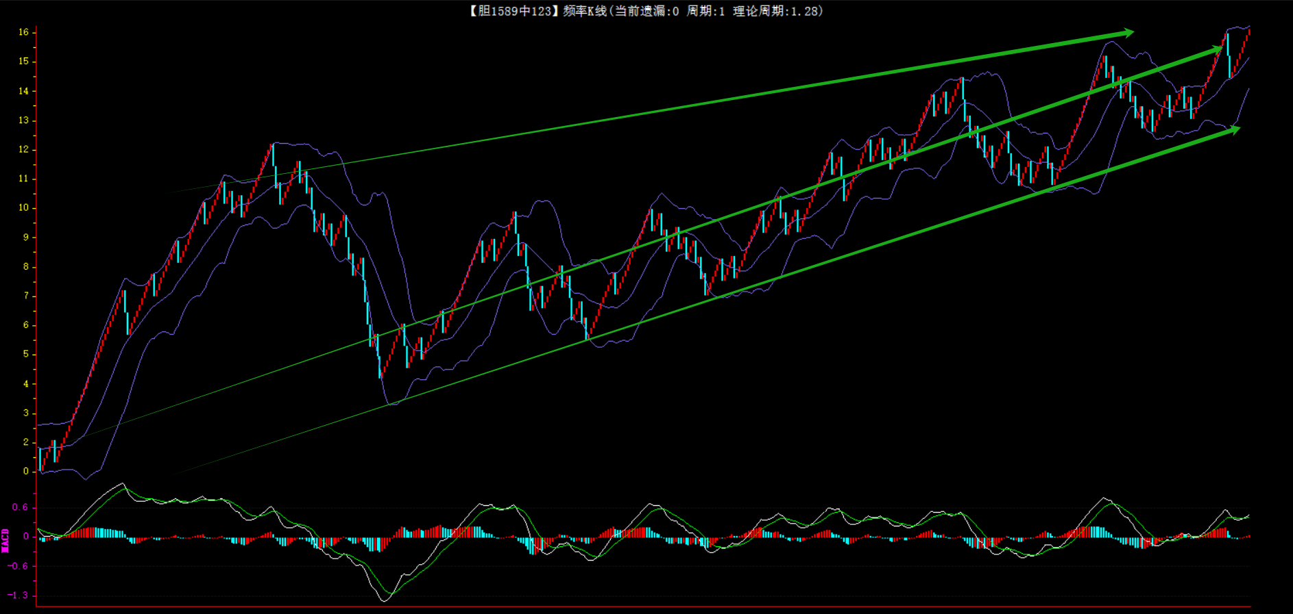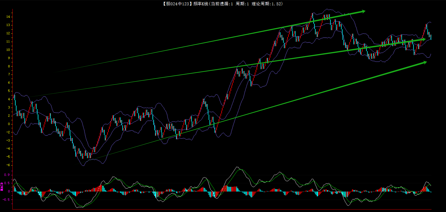 整体趋势上行,上边沿线趋势向上,下边沿趋势也是向上,节点震荡,当前遗漏1期,本期关注。
