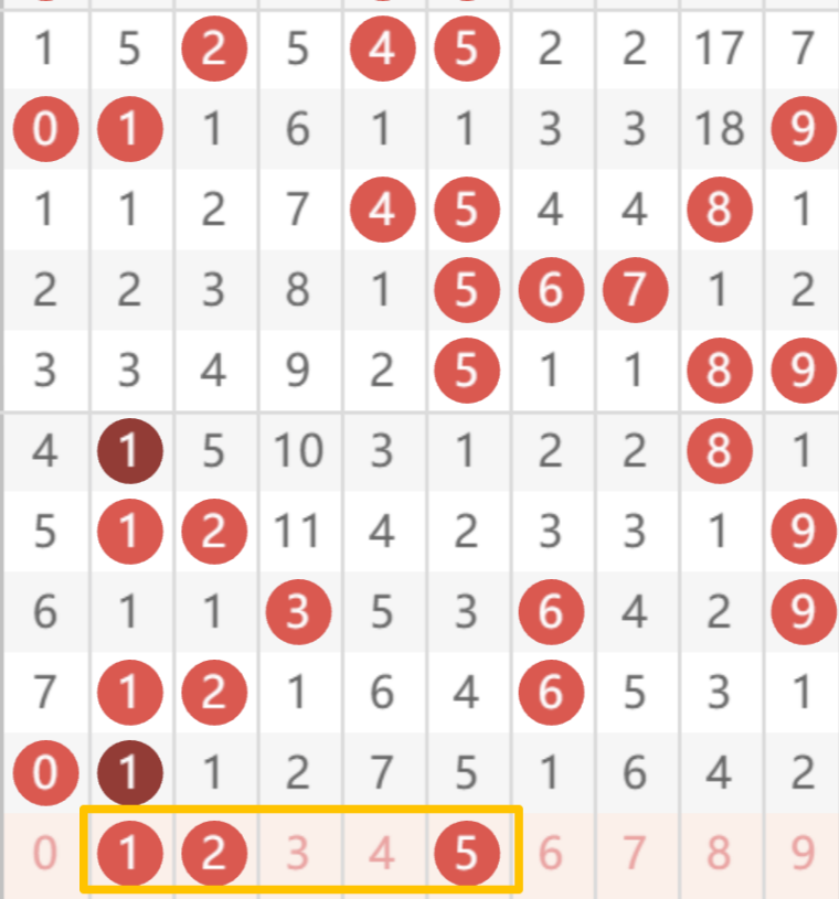 十位:十位热号 5(8 次,位置最热),核心温号 1、2、4、6(占十位出号 70%),补防温号 7、8;排除冷号 0、3(十位仅 3 次,遗漏期数长);覆盖小(1/2/4)、大(5/6/7/8),奇偶均衡(奇 1/5/7、偶 2/4/6/8)。