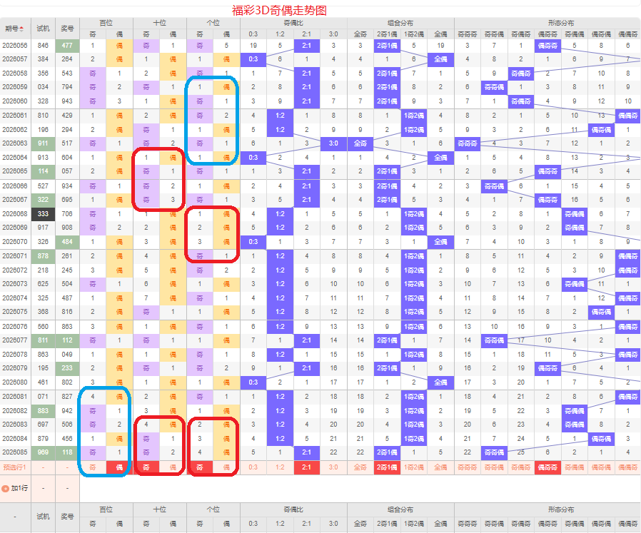 上期奇偶比是2:1,两奇的号码组合方式,从近五期的奇偶数出现情况看,奇数出现6次,偶数出现9次,奇数号码出现较少,本期侧重两奇的号码组合,侧重偶奇奇或偶奇偶的号码组合方式,根据奇偶形态做五码定位02468/13579/13579或02468/13579/02468