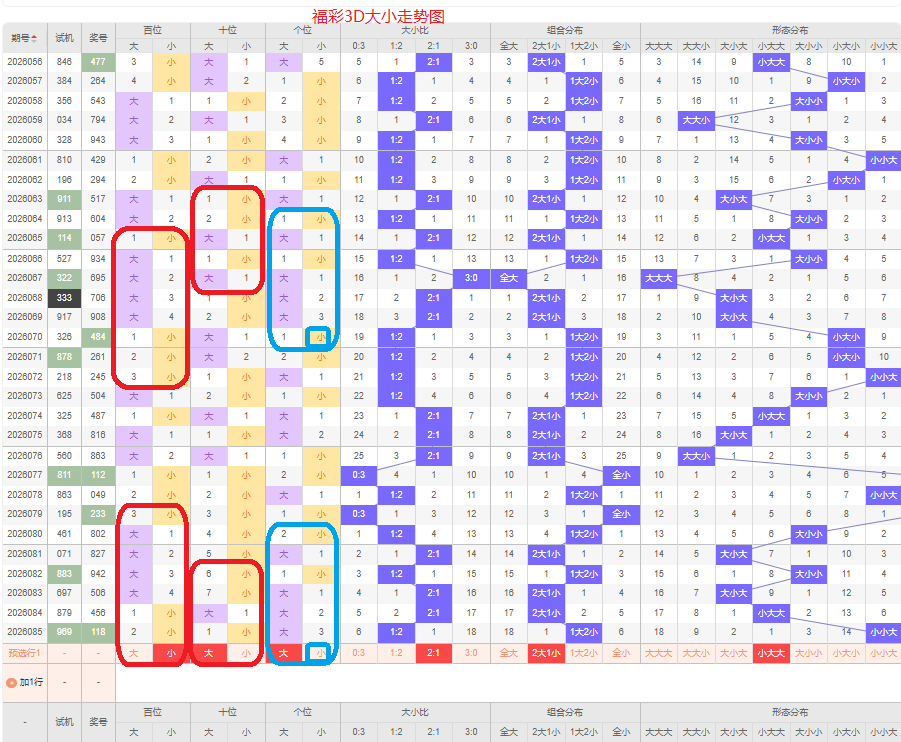 上期大小比为1:2,两小的号码组合方式,从近五期出现情况看,大号码出现8次,小号码出现7次,大小号码出现较平均,本期侧重两大的号码组合,本期百位侧重小号码,十位侧重大号码,个位要侧重看大,侧重小大大或者大小大的号码组合,根据大小做五码定位01234/56789/56789或56789/01234/56789