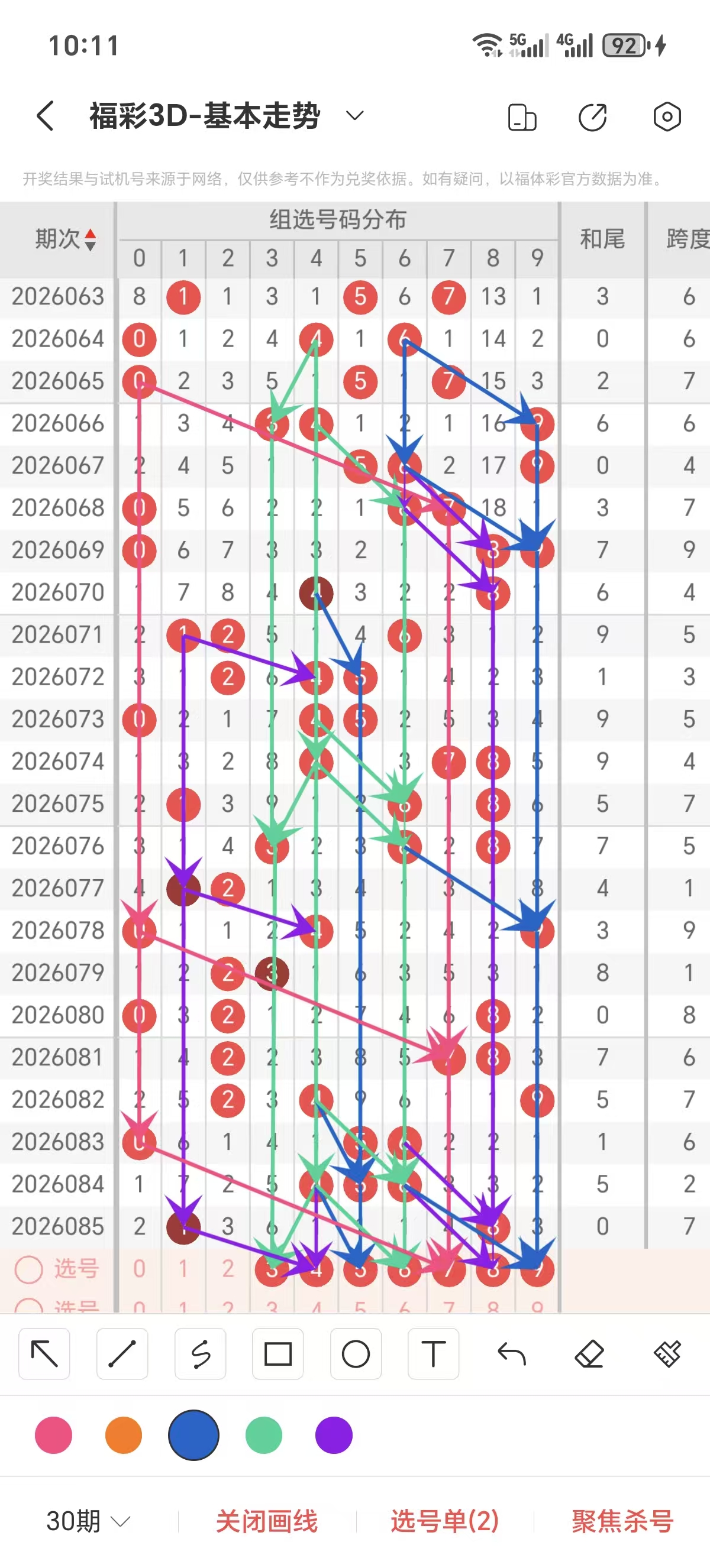 跨度通常情况下在五期之内重复一个跨度的概率很高,近五期重复了6/7的跨度,近五期跨度为6/7/6/2/7,近期01路的跨度较热,上期是1路的跨度,本期要侧重跨度以3/4/5跨为主的号码组合。可以从跨度方面选择相应的双胆码组合,双胆码的选取要根据近期和历史的走势进一步的分析选取。