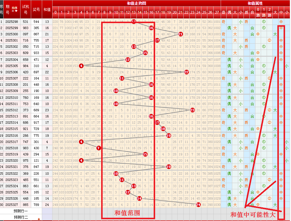 从上图可以开出,按和值大(18-27)中(9-17)小(0-8)分区,上期开出和值大,按近期趋势和跟随表现,本期和值中可能性大,和值大致在8-16间。