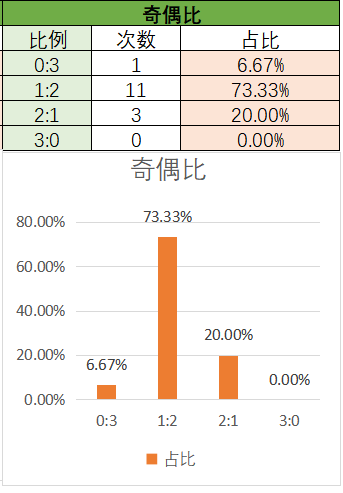 上期奇偶比为1:2,各个类型占比没有变化。近15期内1:2优势最好,其次是2:1,最后是0:3。上期开了1:2奇偶比,本期还是看好1:2奇偶比的开出,其次是2:1。
