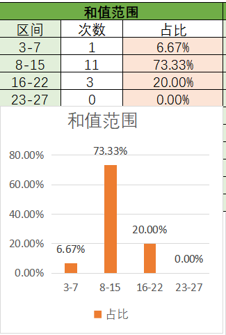 上期和值是13,处于8~15之间,各个类型占比没有变化。目前是8~15占比最优,其次是16~22,最后是3~7。本期看好和值在8~15之间,其次是16~22。
