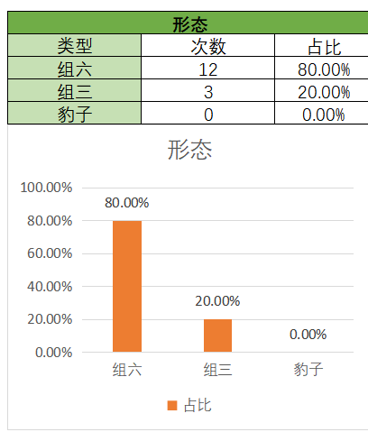 上期开的是组六,各个类型占比没有变化。通过图示可以看到,组六在15期内开了12期,组三开了3期。本期关注组六,防组三。
