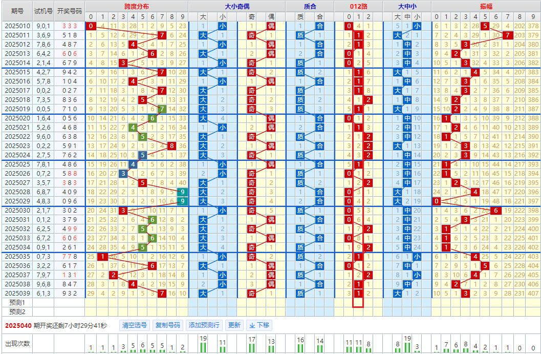 在出现次数上,存在大概的多少多少循环规律,再查看012路情况和周三走势;