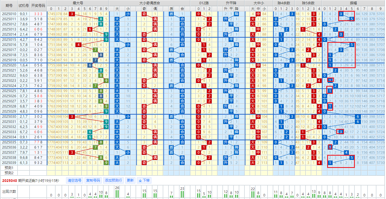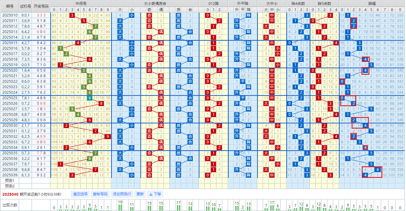2025039期开出932,最大数9,中间数3,最小数2,和值14,均值5,跨度7