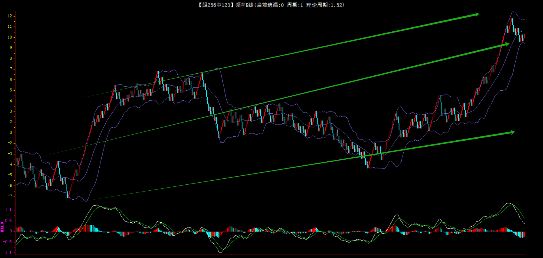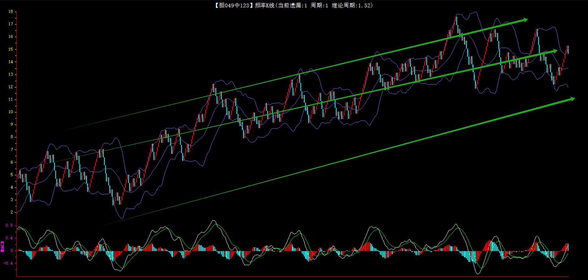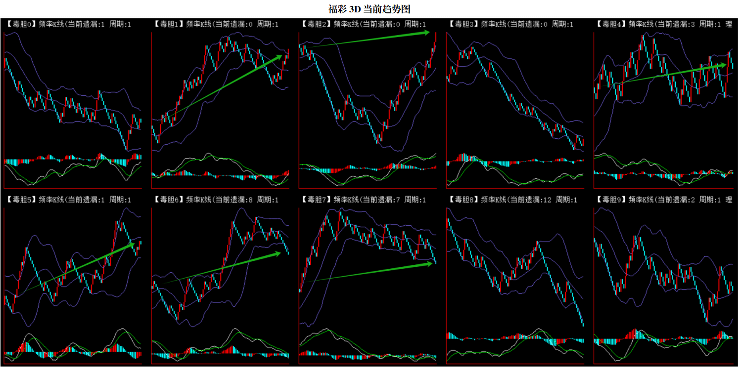 整体趋势上行,上边沿线趋势向上,下边沿趋势也是向上,节点震荡,当前遗漏1期,本期防守。