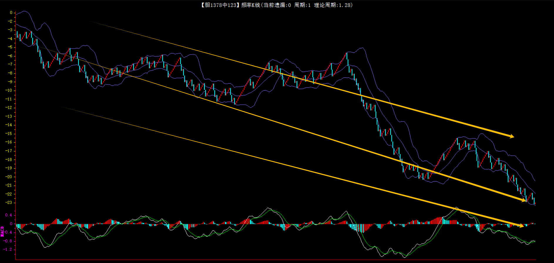 整体趋势下行,上边沿线趋势向下,下边沿趋势也是向下,节点震荡,当前开1期,本期防守。