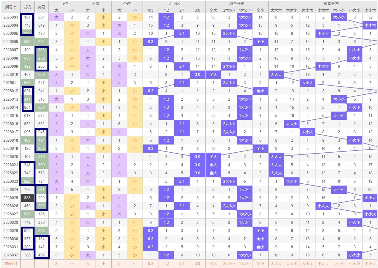 近十期大小比为9:21小数占据优势,关注两大一小组合.