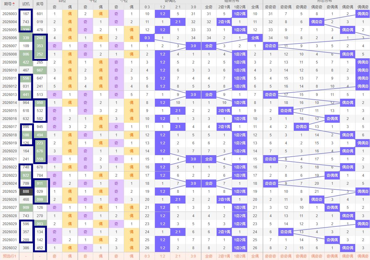 即预测2位奇数搭配1位偶数。近十期奇偶比为14:16关注两奇一偶号码或全奇。