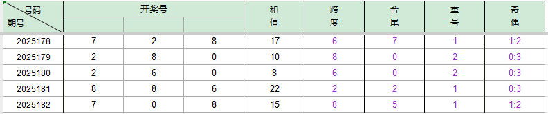 2025179期开奖号码280,我们可以看出近30期百位2出现2次,十位8出现1次,个位0出现1次。