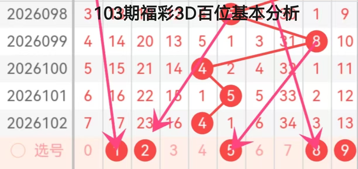 结合箭头标注的指向信息,本期百位的重点关注号码锁定为1、2、5、8。其中,数字1与2承接了前期低位号的回补信号,在长连升走势后,低位号具备较强的反弹需求;数字5作为中间过渡号,在100-101期的4、5走势中形成了延续性,属于温号回补范畴;数字8则是高位号的延续延伸,与99期的8形成呼应,可作为防号备选。综合来看,百位的主选号码优先考虑2、5,兼顾1、8的回补可能,形成“两主两防”的选号策略。