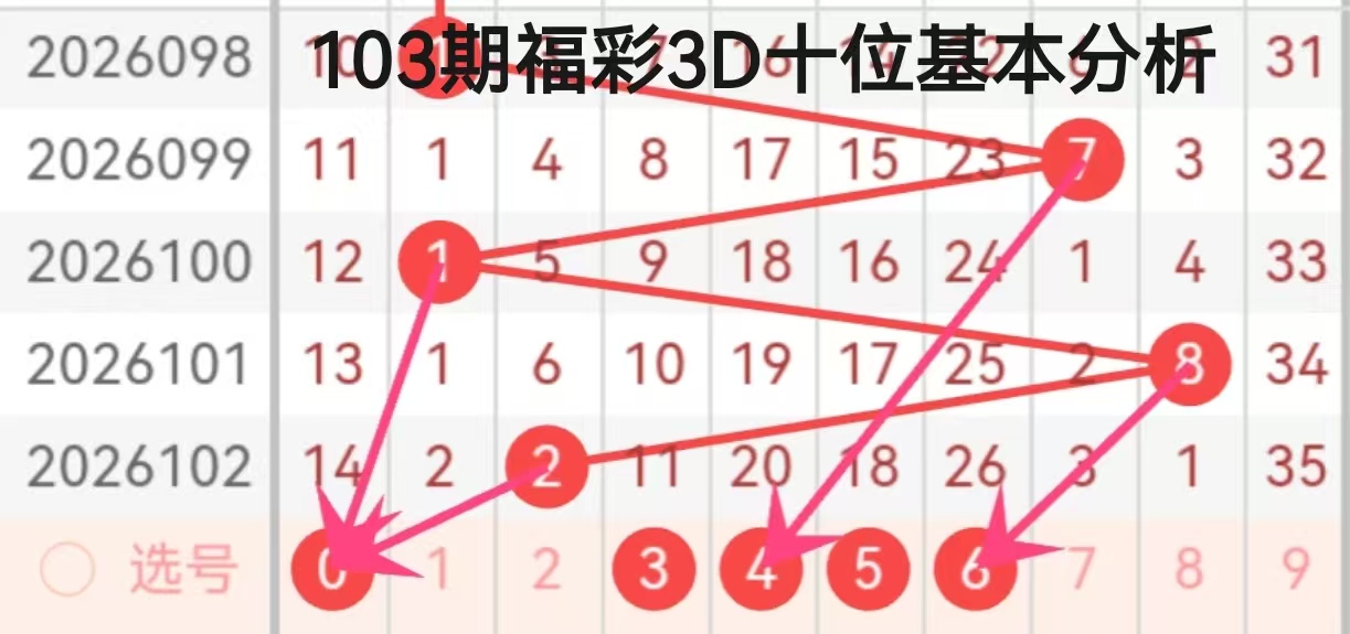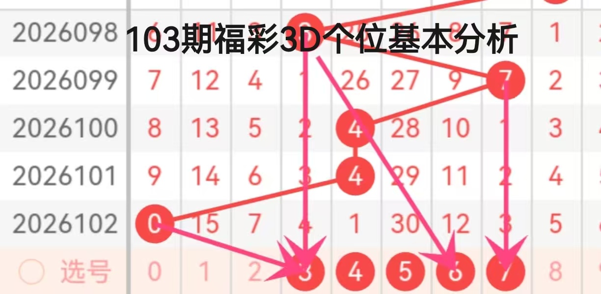 结合箭头标注的指向信息,本期个位的重点关注号码为3、6、7。数字3作为前期递增走势的中间节点,在101期的4号延伸中具备延续性,同时也符合高位号回落的中间过渡特征;数字6与7则承接了99期的7号走势,其中数字7与99期的7形成了直接呼应,属于高位号的回补延续,数字6则处于中间区间,起到高低位的过渡作用。综合来看,个位的主选号码优先考虑3,兼顾6、7的回补可能,重点防范连升走势后的反转回落。