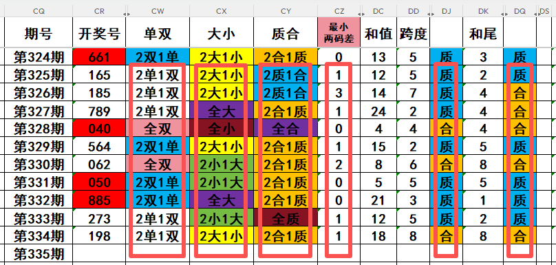 3,最近10天当中,两质一合开出2次,两合一质开出6次,全质数开出1次,全合数开出1次。近期需重点关注开奖号码两质一合的回补!