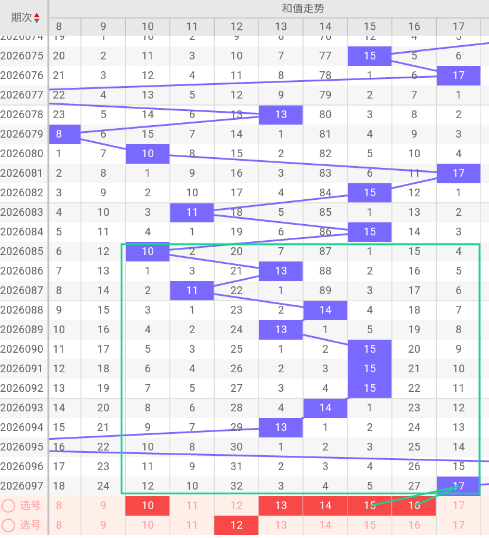 上期和值17。近期和值波动较大,从极端低位4反弹到23,再回落到17,整体呈现一个冲高回落的弧形。这种走势下,和值通常会继续在中等偏上的区域停留。本期和值大概率会落在10-16这个区间,其中10、13、14、15、16都是值得重点关注的方向。12在近期遗漏较久,本期也可作防。