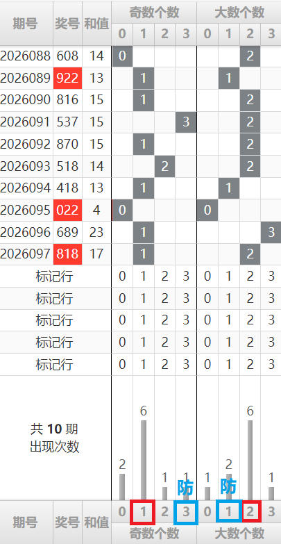 上期大小比为2:1,大数占据上风。在此之前,大小比在全大、全小、1大2小之间切换。本期大小比大概率会继续维持在2大1小的格局,1大2小可以作为防守方向。