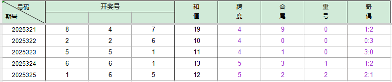 开奖回顾:福彩3D 第2025325期开出中奖号码为165,组合形态为组六、和值为12、合尾2、跨度5、重号2、奇偶比为2:1、百位1近30期出现5期,十位6近30期出现6期,个位5近30期出现5期。