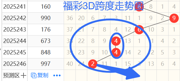 2)我们来看跨度;还是以242期——246期为例,如图依次是96442跨度,按照路数转换关系来看,那么跨度我们暂定147369跨,本期个人比较看好6 4跨。
