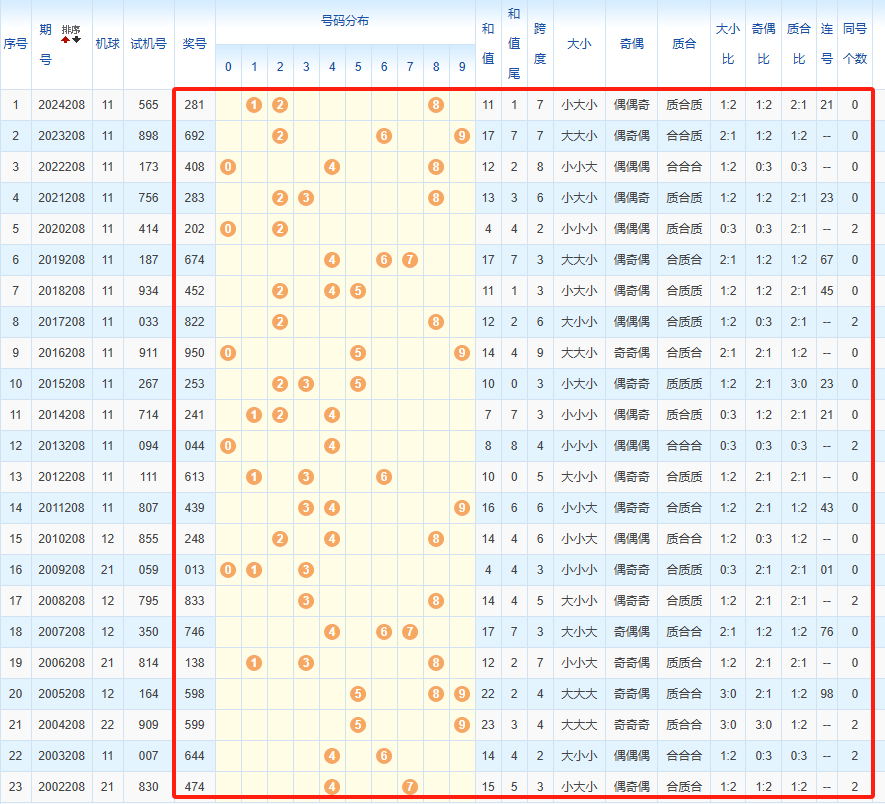 这23期大小比1:2出靠前,这期可以考虑选1:2。奇偶2:1出靠前,奇偶比可以考虑2:1