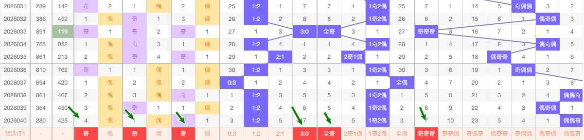 (二)、奇偶分析 奇数 13579 偶数 02468 在这5期 数据中 奇数出现4次 偶数出现 11次 从昨天出号来看偶数占优, 本期看好偶数有号 看好 奇偶奇 奇奇奇