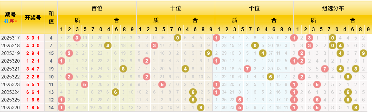 • 号码重点:若为组六,则关注连码;若为组三,则核心是选好“对子”号码。胆码可重点关注 4、6、7、9