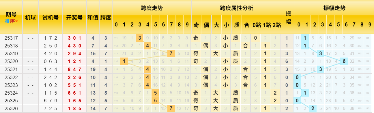 近10期跨度值(截至326期)为:3, 4, 7, 1, 4, 4, 4, 5, 5, 7。上期开出跨度7,本期跨度可能回落至中小区间,重点关注 跨度3、5、6