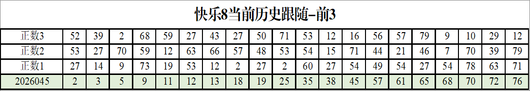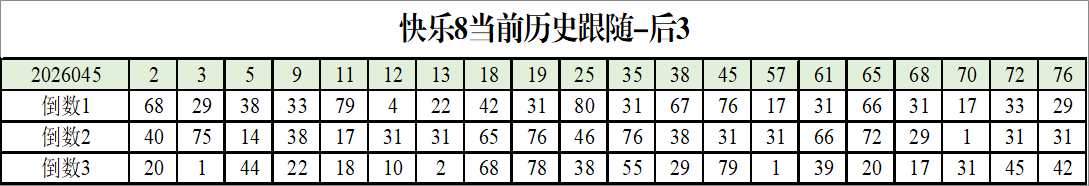 我感觉选热的同时,还要注意防冷条件开出,可以直接选取每个号码跟随出次前三的号码,也可以考虑把出次最后的三个数字加进去,不过这样可能号码太多,可以尝试。图上也能看出单独号码跟随的情况,我就不一一统计每个号码的出次了,我这里考虑提高概率,取每个号码历史跟随的前三号码和后三号码,根据2026045期的号码,我关注正数3和倒数3的号码号码为: