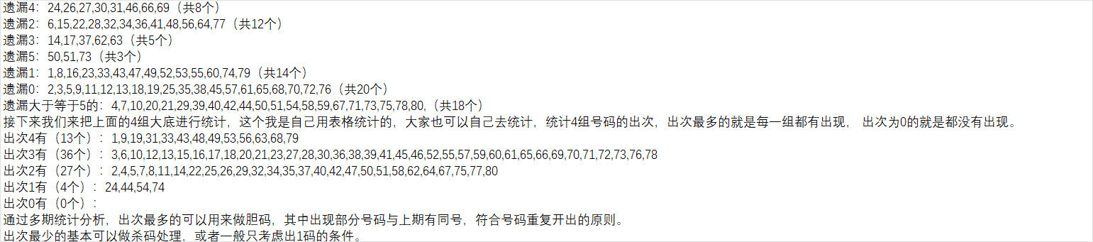 如果把对数和补数合起来有40个号码,中间可能还会产生一下重复数,通过近几期的统计分析,以上期数据进行补数对数计算推算下一期的概率不高。为提高概率,我主要是用前两期的数据来进行对数补数推算,然后再组成一个集合,作为我的第四组大底号码。