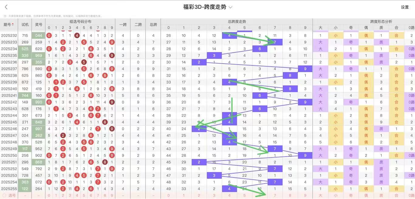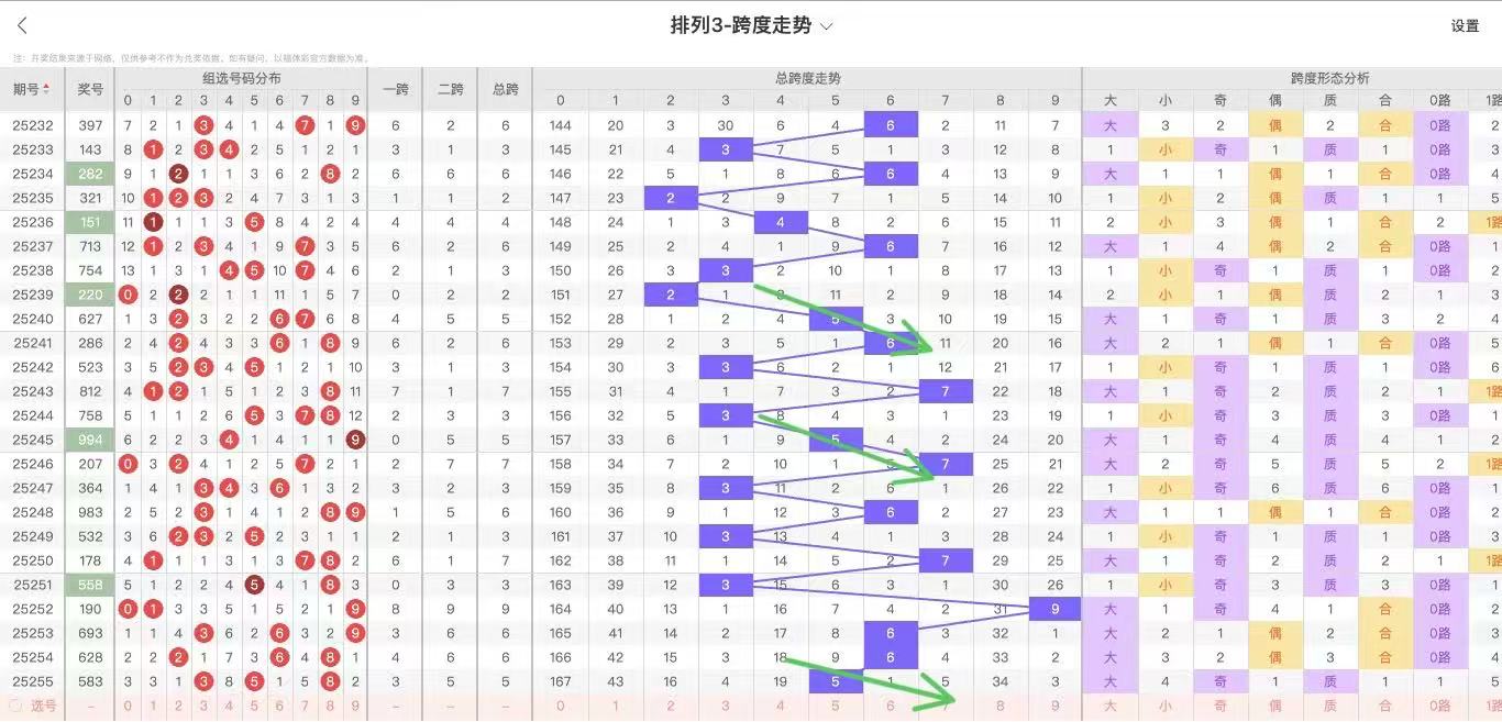 10期内跨度走势为:7-3-6-3-7-3-9-6-6-5,10期内大小跨比:7:3,奇偶跨比7:3,百期内跨度5共开出的18次,下期数据:5 6 6 3 5 5 4 2 6 4 3 4 6 1 2 6 7 近期度较热,考虑跨度5开出后容易出大跨度,近期大小规律下大:奇:质,所以接下来继续小跨,奇跨度表现!
