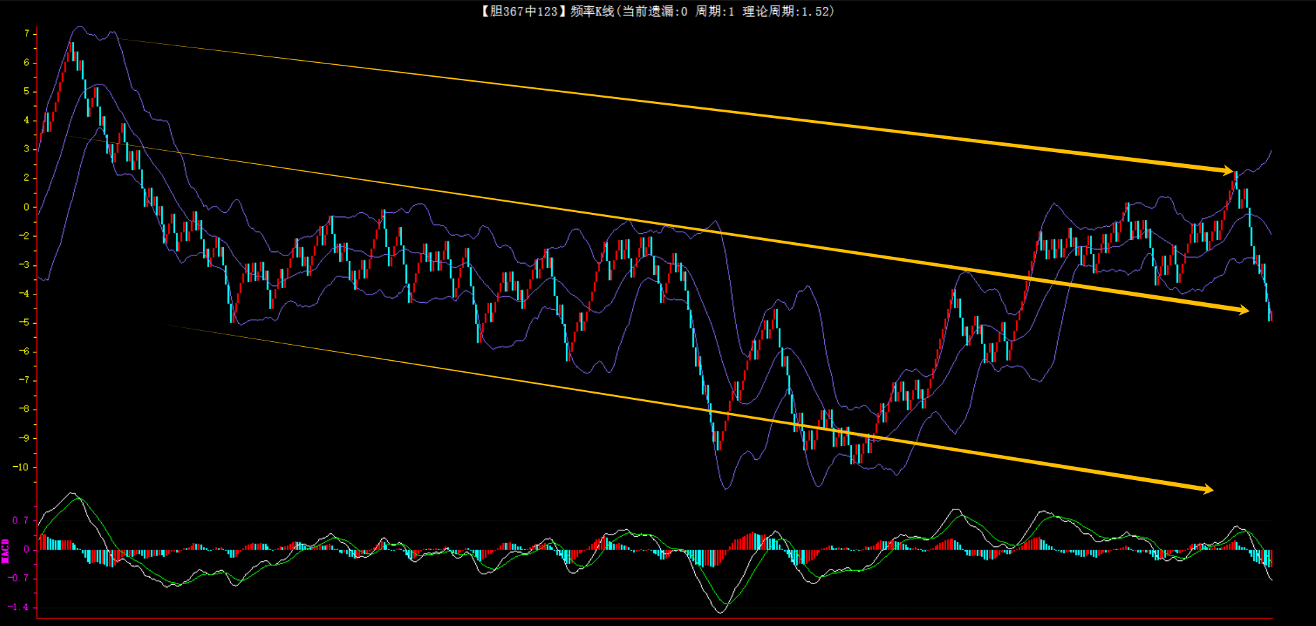 整体趋势下行,上边沿线趋势向下,下边沿趋势也是向下,节点震荡,当前开1期,本期防守。