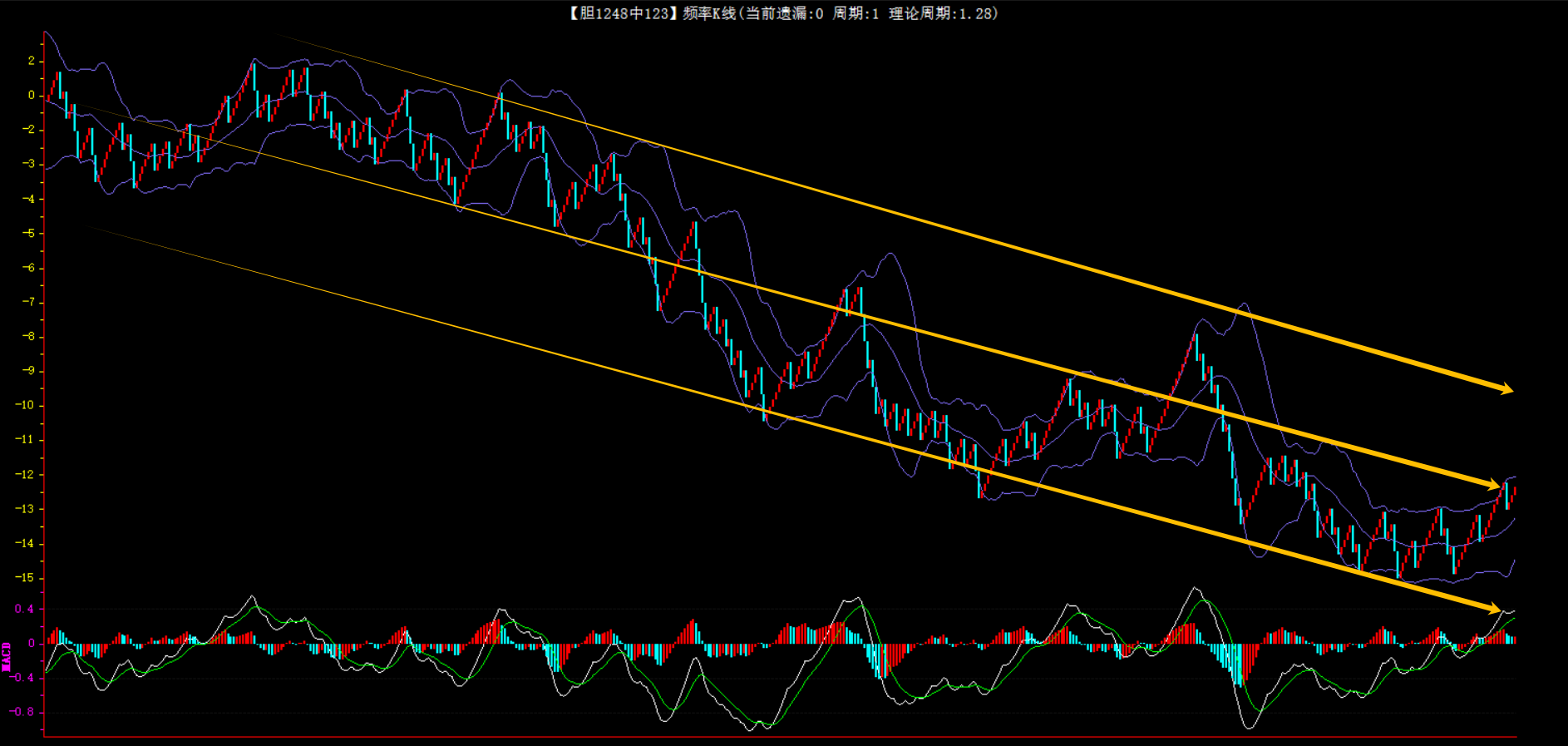 整体趋势下行,上边沿线趋势向下,下边沿趋势也是向下,节点震荡,当前连开3期,本期防守。