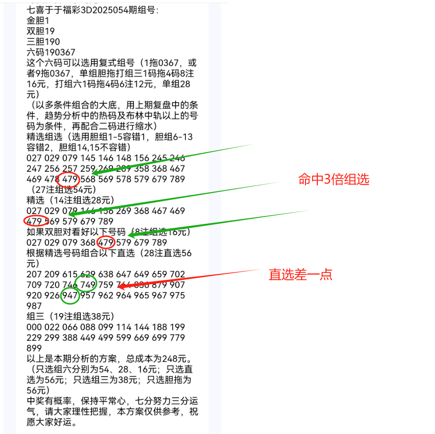 上期“会员专区”文章分析,精选8注对,命中3倍组选,直选差一点,综合奖金519元。