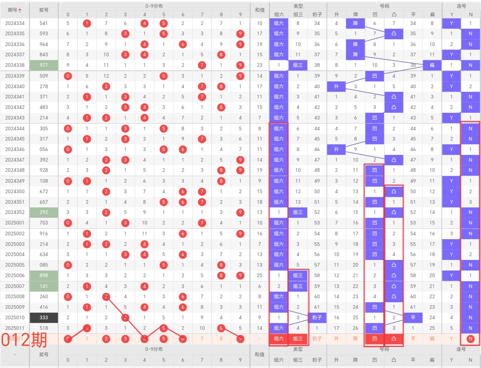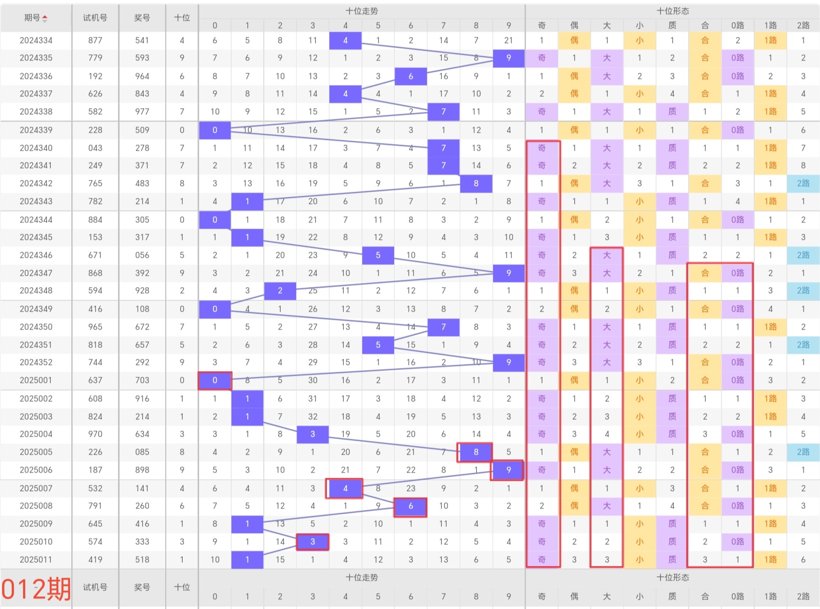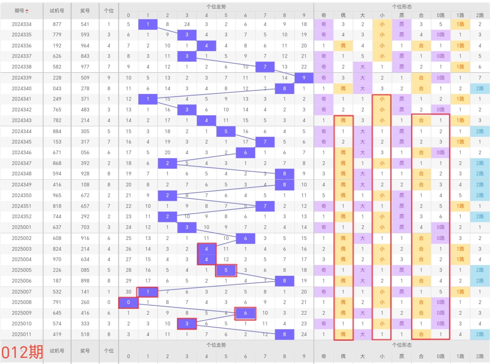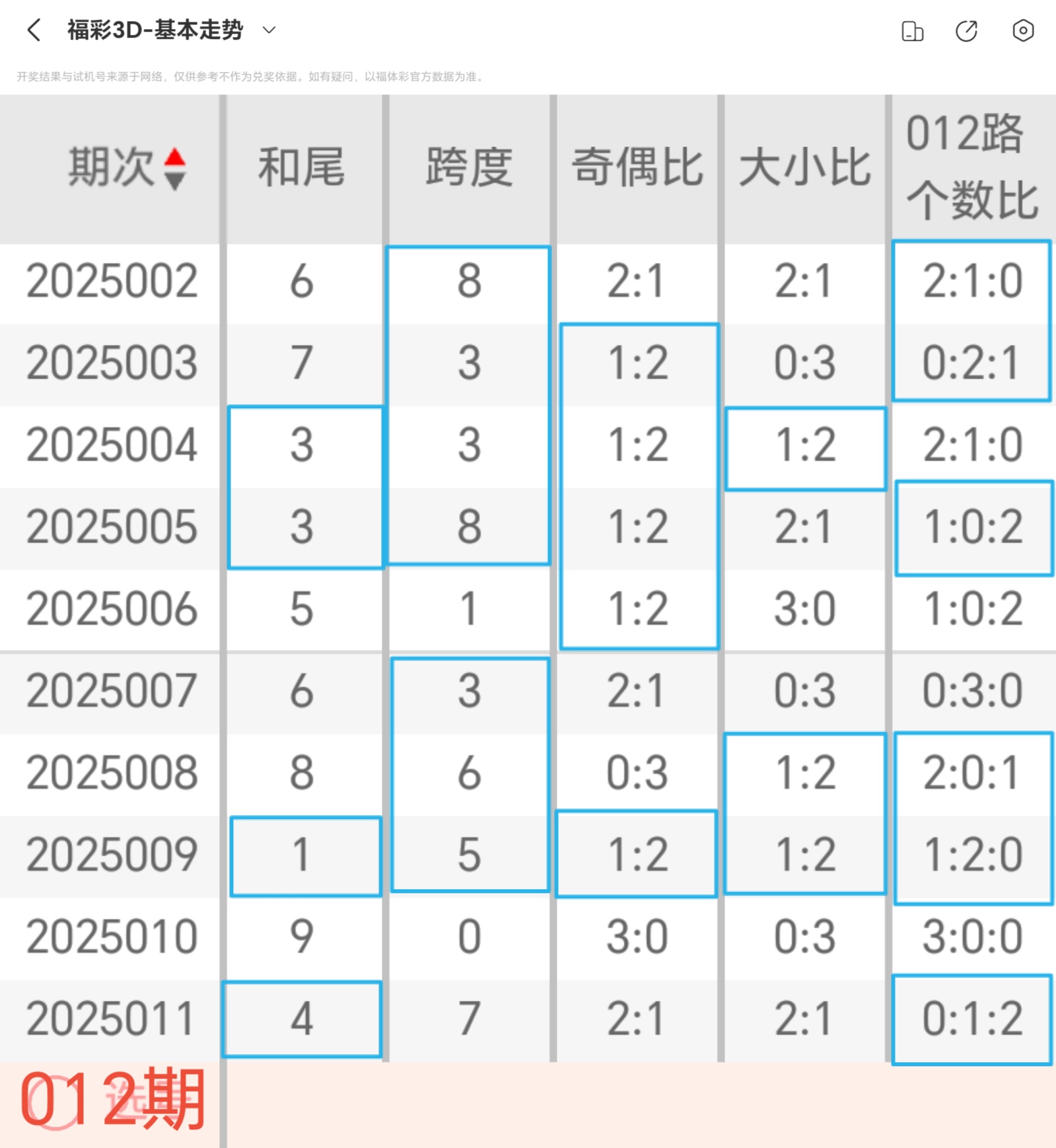 012路:上期断0路号码0、3、6、9,本期关注三路号码同出,防守断2路号码2、5、8。