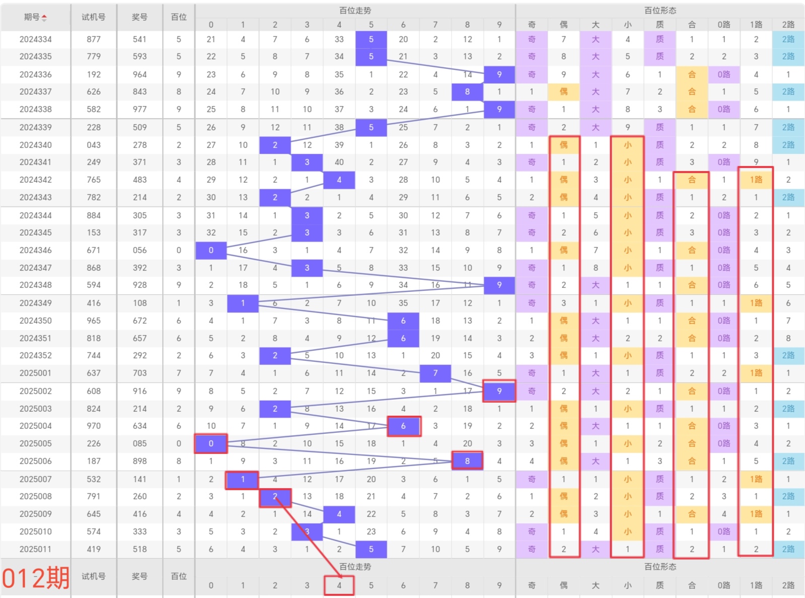 012比:0:1:2。 0路号码:0、3、6、9。1路号码:1、4、7。2路号码:2、5、8。