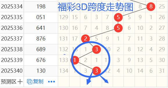 2)我们来看跨度;还是以336期——340期为例,如图依次是52313跨度,按照路数转换关系来看,那么跨度我们暂定147369跨 ,本期个人比较看好4 2跨。