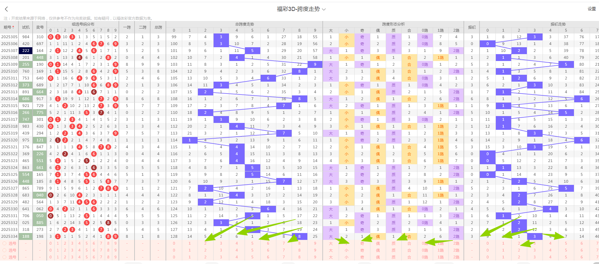 今天福彩3D第2025335期的趋势判断为:方向主看组六防组三;跨度回落明显;和值回落概率较大;