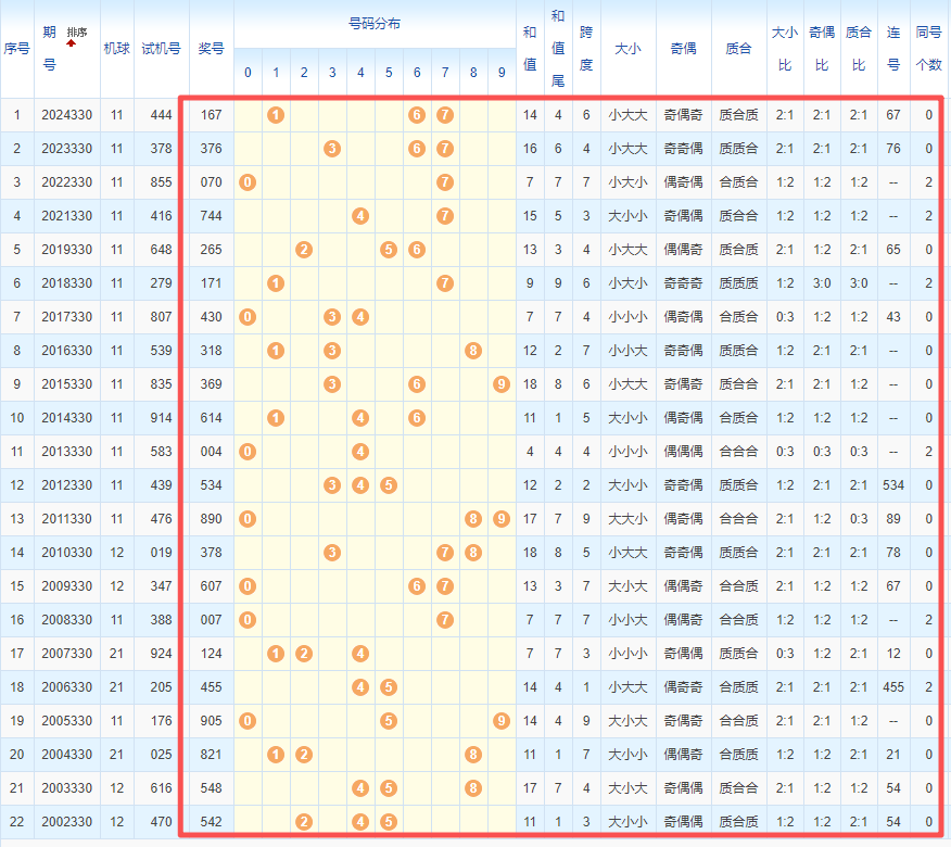 这22期跨度34567趋势好,这期可以考虑34567跨度。