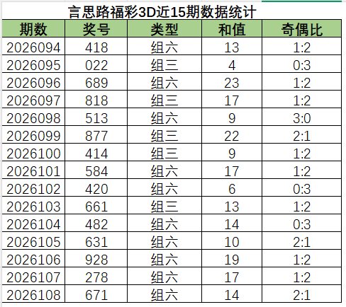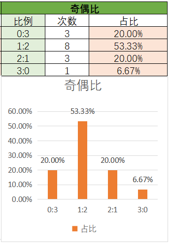 上期奇偶比为2:1,各个类型占比没有变化。近15期内1:2优势最好,然后是2:10:3,最后是0:3上期开了2:1奇偶比,本期看好1:23:0奇偶比的开出,其次是2:10:3