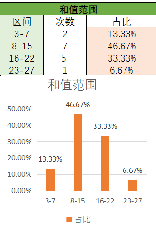 上期和值是14,各个类型占比没有变化。目前是8~15占比最优,其次是16~22,然后是3~7,最后是23~27。本期看好和值在8~15之间,其次是16~22