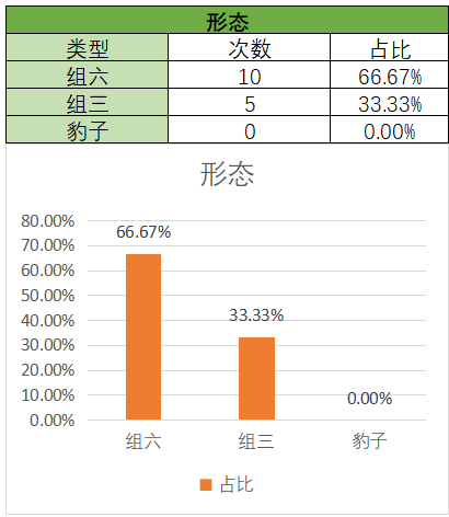 上期开的是组六,各个类型占比没有变化。通过图示可以看到,组六在15期内开了10期,组三开了5期。本期关注组六,防组三