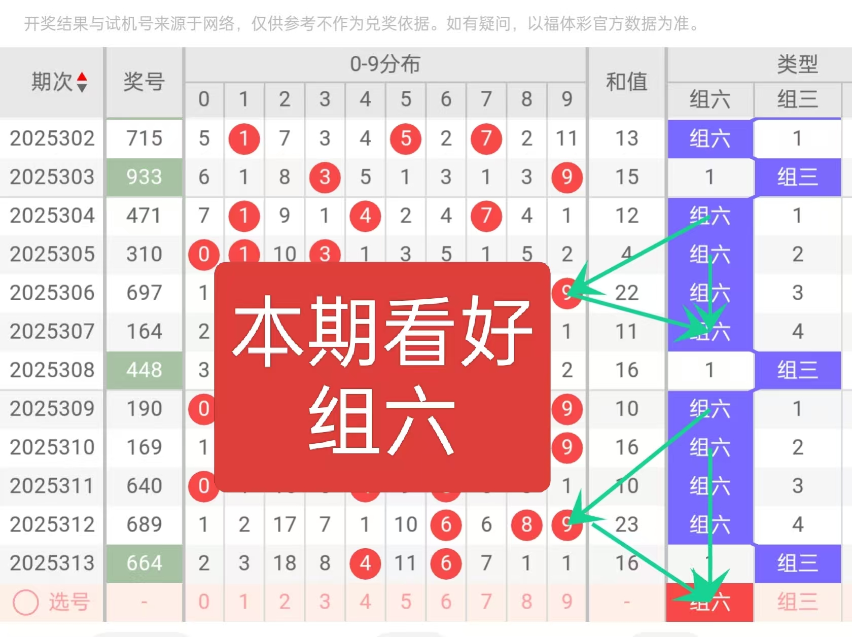 福彩3D组六理论概率为72%,且历史数据中连续组三后多回归组六。本期组三(2025313期)后,下期组六概率显著提升。