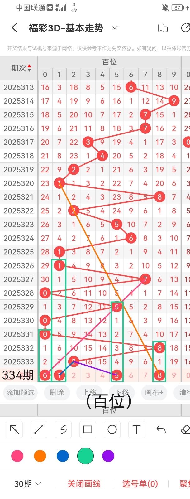 首先,小梁给大家分享每期福彩3D杀一百位:6;准确率高达95.36%。其次,我们根据图中画线的思路可以看出,号码0与前几期开出的号码呈斜三连的走势且呈隔两期回补的走位,跨度为2;号码1与前几期开出的号码呈隔七期回补的走位且呈斜连的走势,跨度为1;号码5与前几期开出的号码呈隔四期回补的走势且呈斜连的走位,跨度为3。然后,如图所示,号码8与前几期开出的号码呈隔期回补的走位且呈斜三连的走势,跨度为6。综上所述,小梁推荐百位的号码:0、1、5、8。