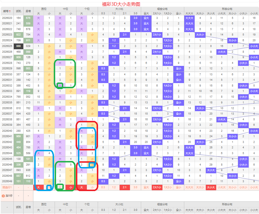 上期大小比为0:3,全小的号码组合方式,从近五期出现情况看,大号码出现5次,小号码出现10次,大号码出现较少,本期侧重两大的号码组合,本期百位侧重大号码,十位侧重小号码,个位要侧重看大,侧重大小大或者小小大的号码组合,根据大小做五码定位56789/01234/56789或01234/01234/56789