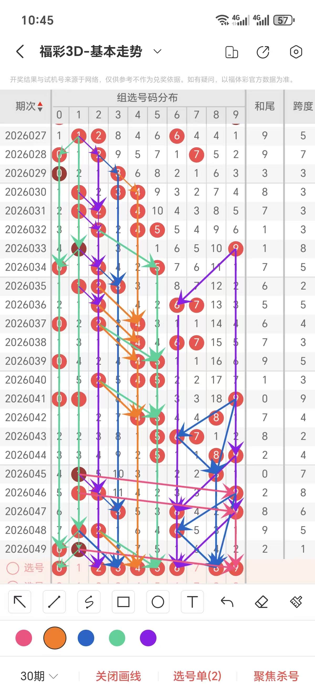 跨度通常情况下在五期之内重复一个跨度的概率很高,近五期没有重复的跨度,近五期跨度为7/8/6/5/1,近期12路的跨度较热,上期是1路的跨度,本期要侧重跨度以6/7跨为主的号码组合。可以从跨度方面选择相应的双胆码组合,双胆码的选取要根据近期和历史的走势进一步的分析选取。