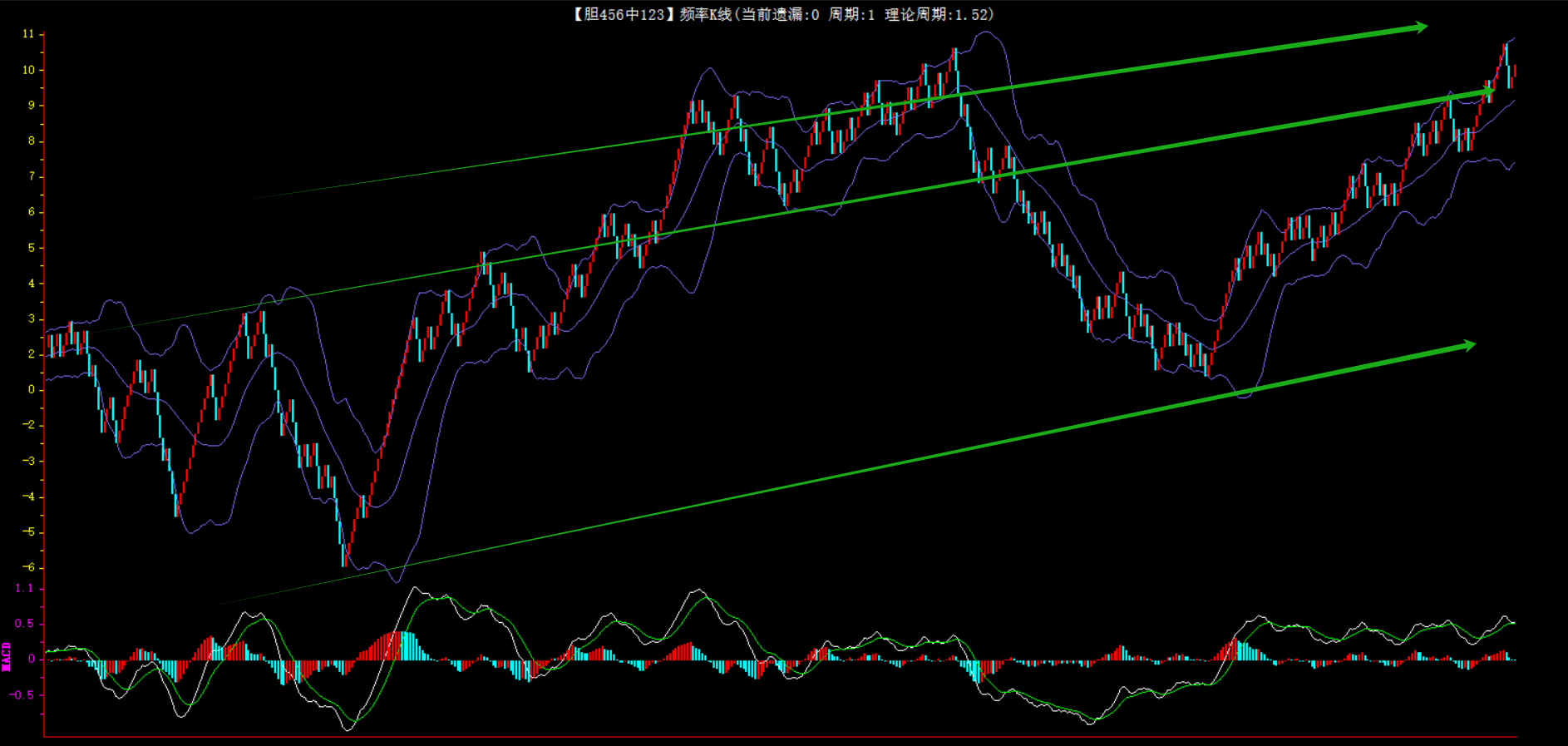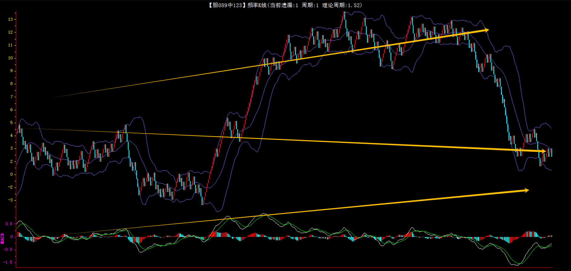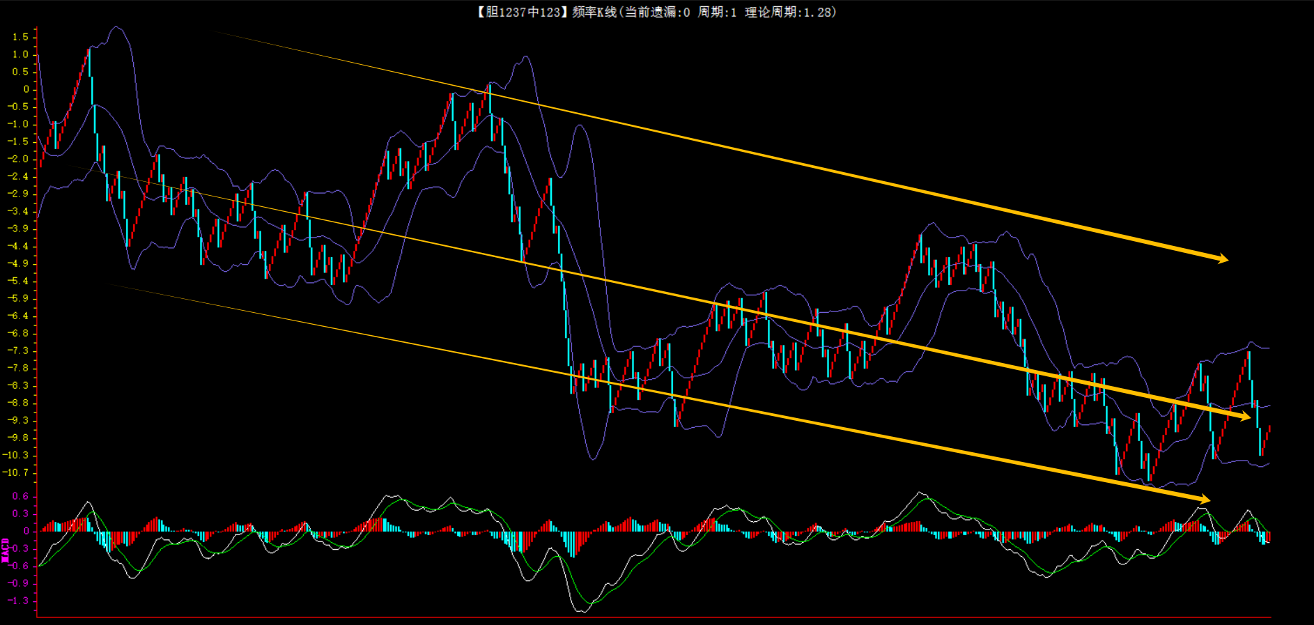 整体趋势下行,上边沿线趋势向上,下边沿趋势也是向上,节点震荡,当前遗漏1期,本期防守。