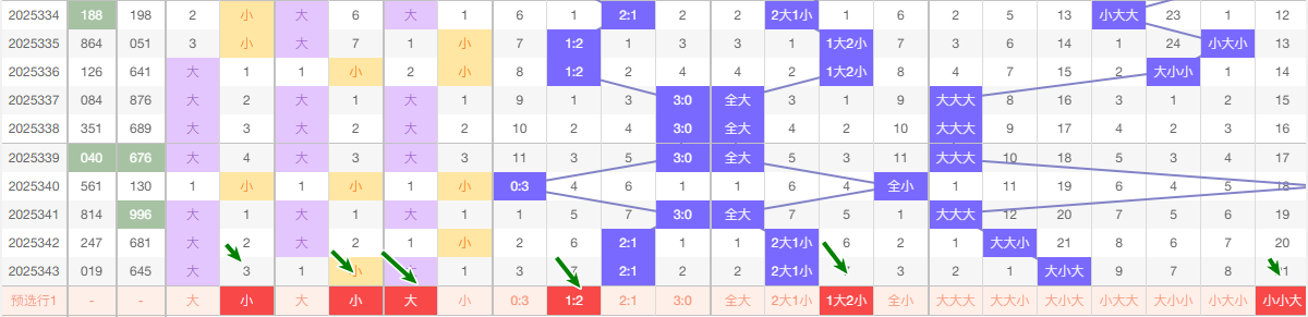 最近的5期当中十位大数出现的频次3次 小数出现2次 ,趋势平和 本期看好走小