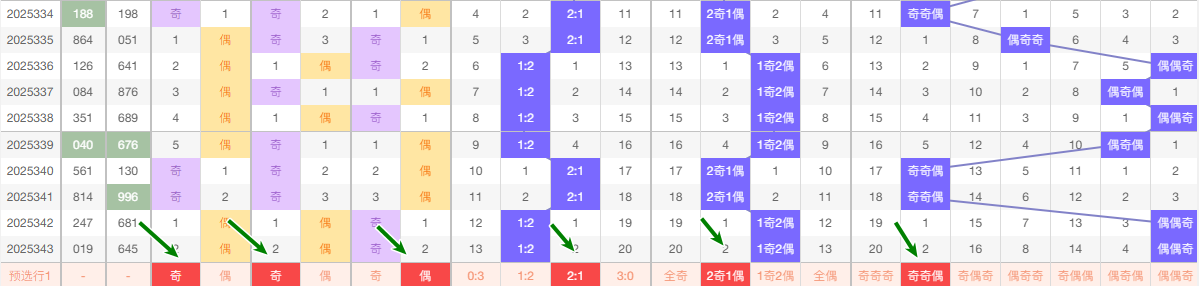 (二)、奇偶分析 奇数 13579 偶数 02468 在这5期 数据中 奇数出现7次 偶数出现 8次 从昨天出号来看偶数占优, 本期还是看好奇数有号 看好 偶偶奇 奇偶奇