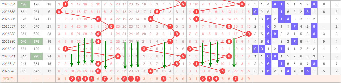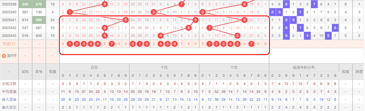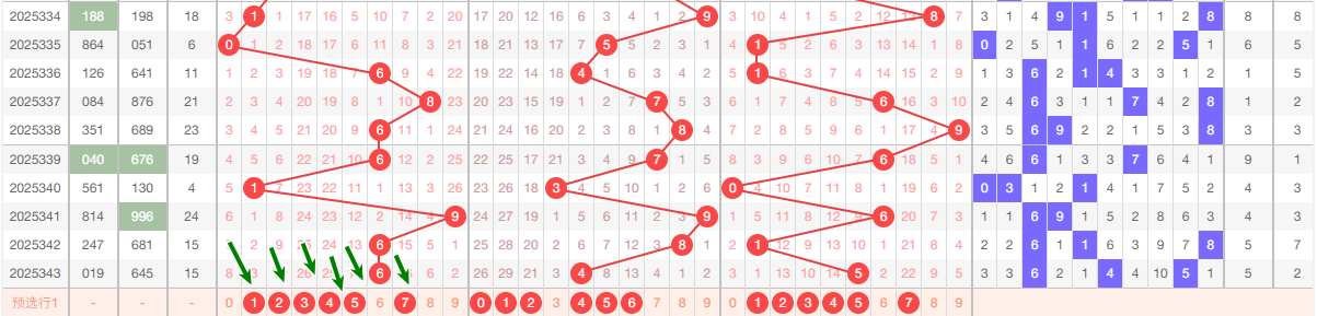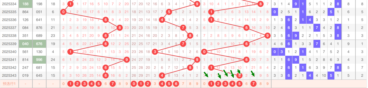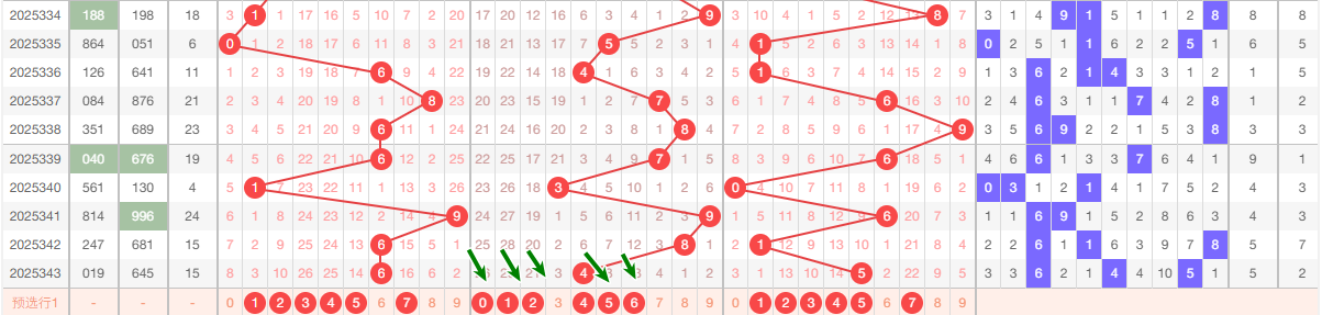 上期十位开出4,本区与上期的跨度为4,本期我们可以从上面走势图中看出选号的思路,本期十位推荐关注:012456